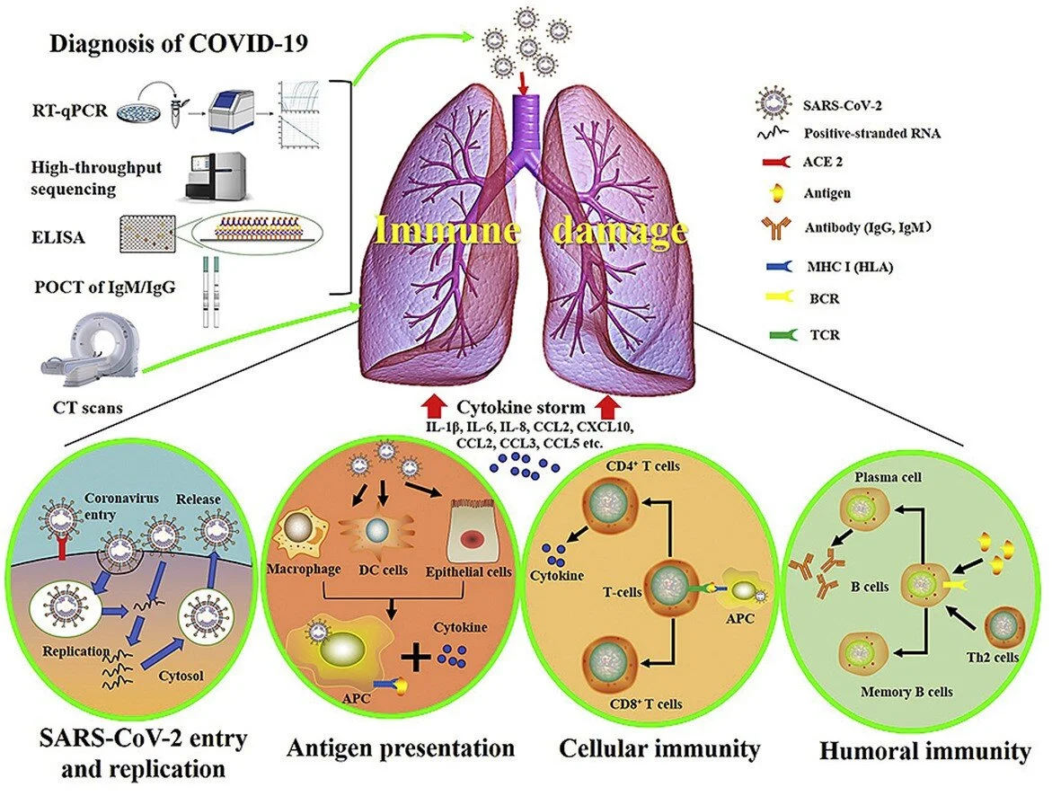 SARS-CoV-2 enters cells via ACE-2 receptors which are expressed by epithelial cells of the lung, intestine, kidney, and blood vessels. Initial cellular injury is causes by direct viral Cytopathic effect (anti-viral therapy is likely to help at this stage). Subsequently, additional damage is caused by cytokine storm (Immunomodulation therapy, such as IL-6 blockers, are likely to help at this stage). To learn more, read this chapteron Advances in Virus Research.